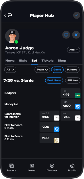 Track live odds and player futures in one streamlined hub. From game lines to player props, get instant access to the best odds across major sportsbooks, with customizable alerts for your favorite players.